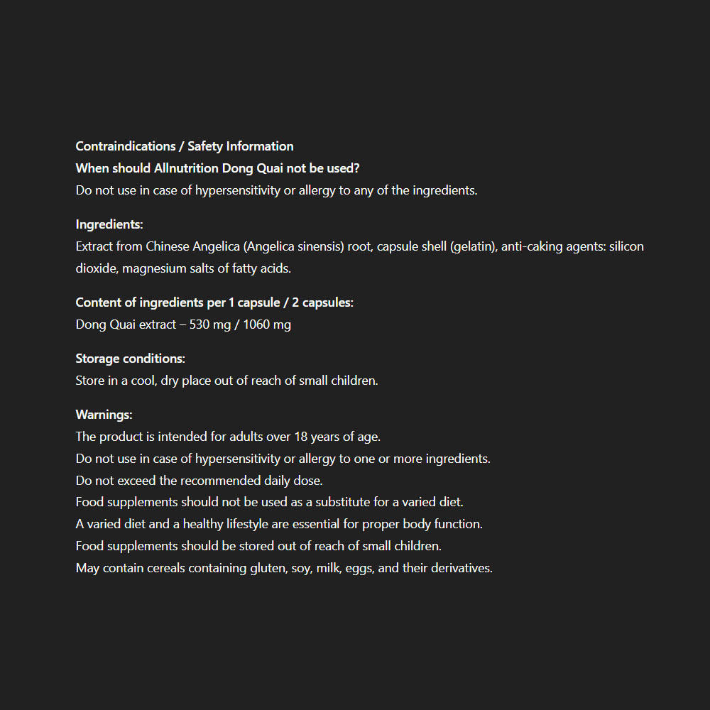 ALLNUTRITION DONG QUAI enthält 1060 mg Dong-Quai-Wurzelextrakt in der empfohlenen Tagesdosis. Das Supplement kommt in leicht zu schluckenden Kapseln und unterstützt die Gesundheit von Frauen während der verschiedenen Phasen ihres Zyklus.
