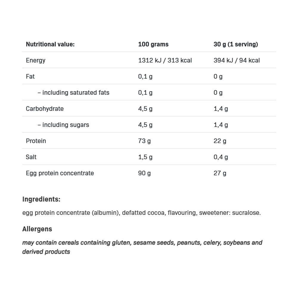 EGG WHITE PROTEIN ist ein hochwertiges Supplement auf Basis von Eikonzentraten – eine ausgezeichnete Alternative zu klassischen Whey-Protein-Präparaten. Dank seines hohen biologischen Werts, optimalen Aminosäureprofils und fehlendem Zuckerzusatz unterstützt es aktive Menschen und ist die perfekte Wahl für alle, die WPC-basierten Supplements nicht vertragen.