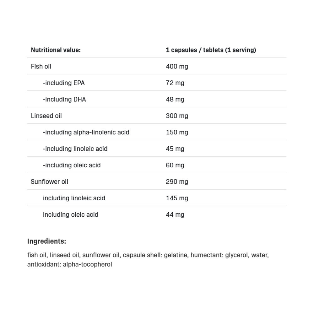 Das Produkt enthält nicht weniger als 400 mg Fischöl und 300 mg Leinsamenöl. Darüber hinaus enthält es 290 mg Sonnenblumenöl und ist somit eine hervorragende Quelle für ungesättigte Fettsäuren!
