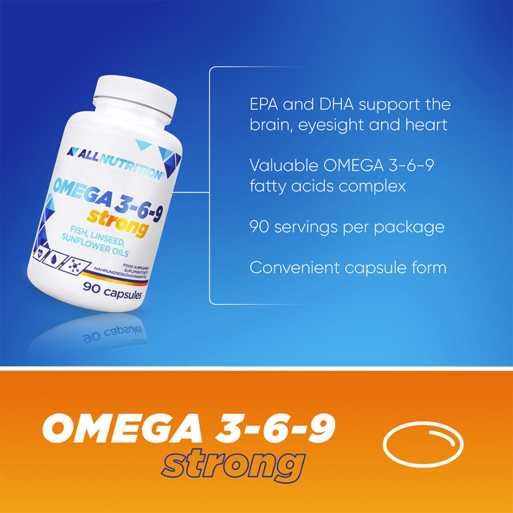 ALLNUTRITION OMEGA 3-6-9 STRONG ist ein Nahrungsergänzungsmittel, das Fischöl, Leinsamenöl und Sonnenblumenöl kombiniert, um leistungsstarke Omega-3-, 6- und 9-Fettsäuren zu liefern.