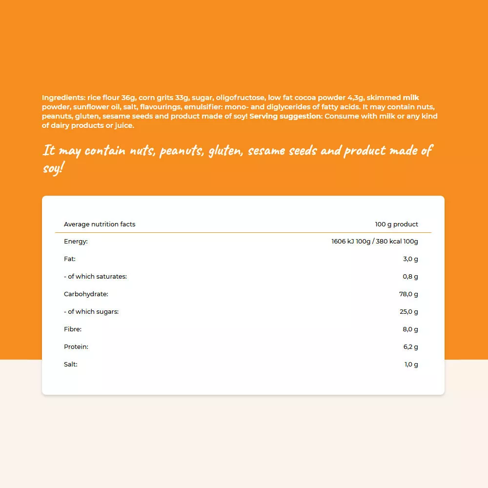 Zutaten: Reismehl 36g, Maisgrieß 33g, Zucker, Oligofructose, fettarmes Kakaopulver 4,3g, Magermilchpulver, Sonnenblumenöl, Salz, Aromen, Emulgator: Mono- und Diglyceride von Speisefettsäuren. Kann Nüsse, Erdnüsse, Gluten, Sesamsamen und Sojaprodukte enthalten! Serviervorschlag: Mit Milch oder anderen Milchprodukten oder Saft verzehren.