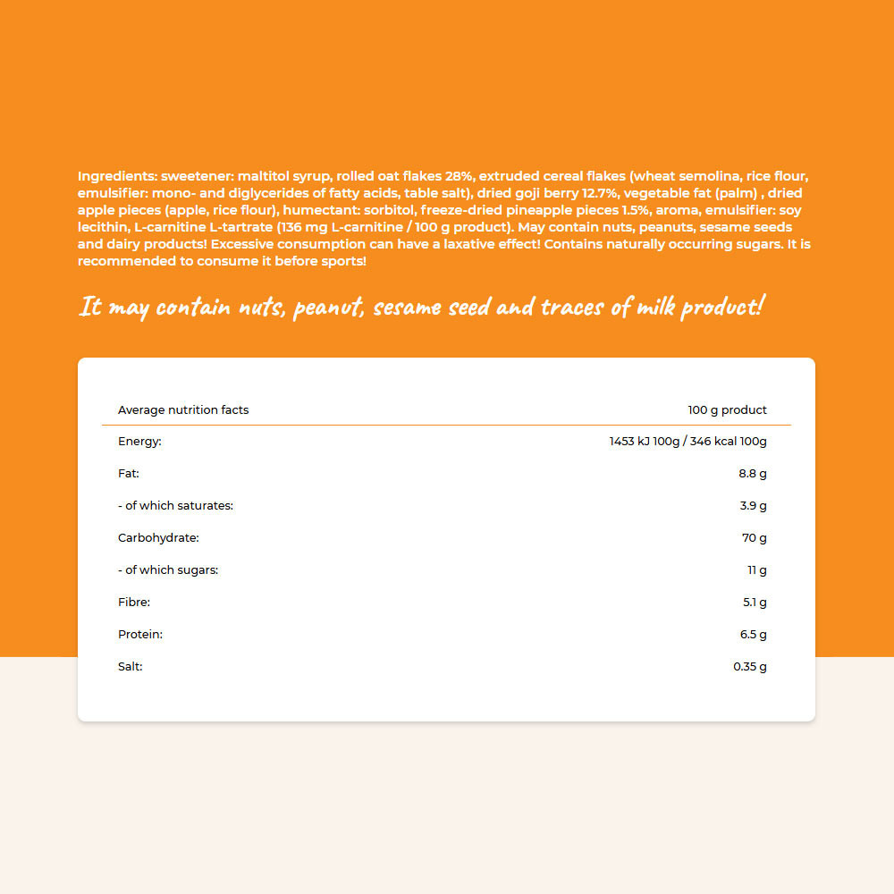 Zutaten: Süßungsmittel: Maltitolsirup, Haferflocken 28%, extrudierte Getreideflocken (Weizengrieß, Reismehl, Emulgator: Mono- und Diglyceride von Speisefettsäuren, Speisesalz), getrocknete Goji-Beeren 12,7%, pflanzliches Fett (Palm), getrocknete Apfelstücke (Apfel, Reismehl), Feuchthaltemittel: Sorbit, gefriergetrocknete Ananasstücke 1,5%, Aroma, Emulgator: Sojalecithin, L-Carnitin-L-Tartrat (136 mg L-Carnitin / 100 g Produkt). Kann Nüsse, Erdnüsse, Sesam und Milchprodukte enthalten! Übermäßiger Verzehr kann abführend wirken! Enthält von Natur aus vorhandenen Zucker. Es wird empfohlen, ihn vor dem Sport zu konsumieren!