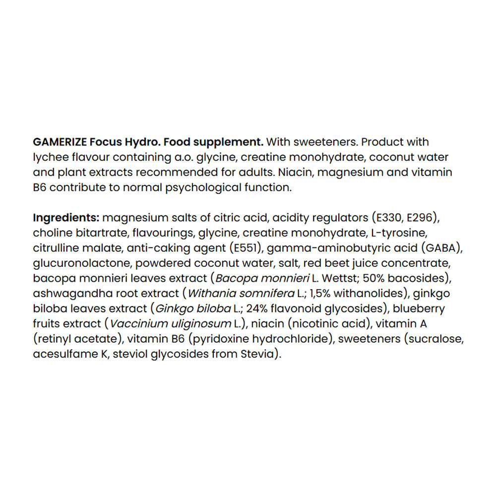 GAMERIZE Focus Hydro ist ein koffeinfreier Pre-Focus-Mix mit Kokoswasser, Kreatin, Glycin und Adaptogenen, um deinen Geist wachsam zu halten.