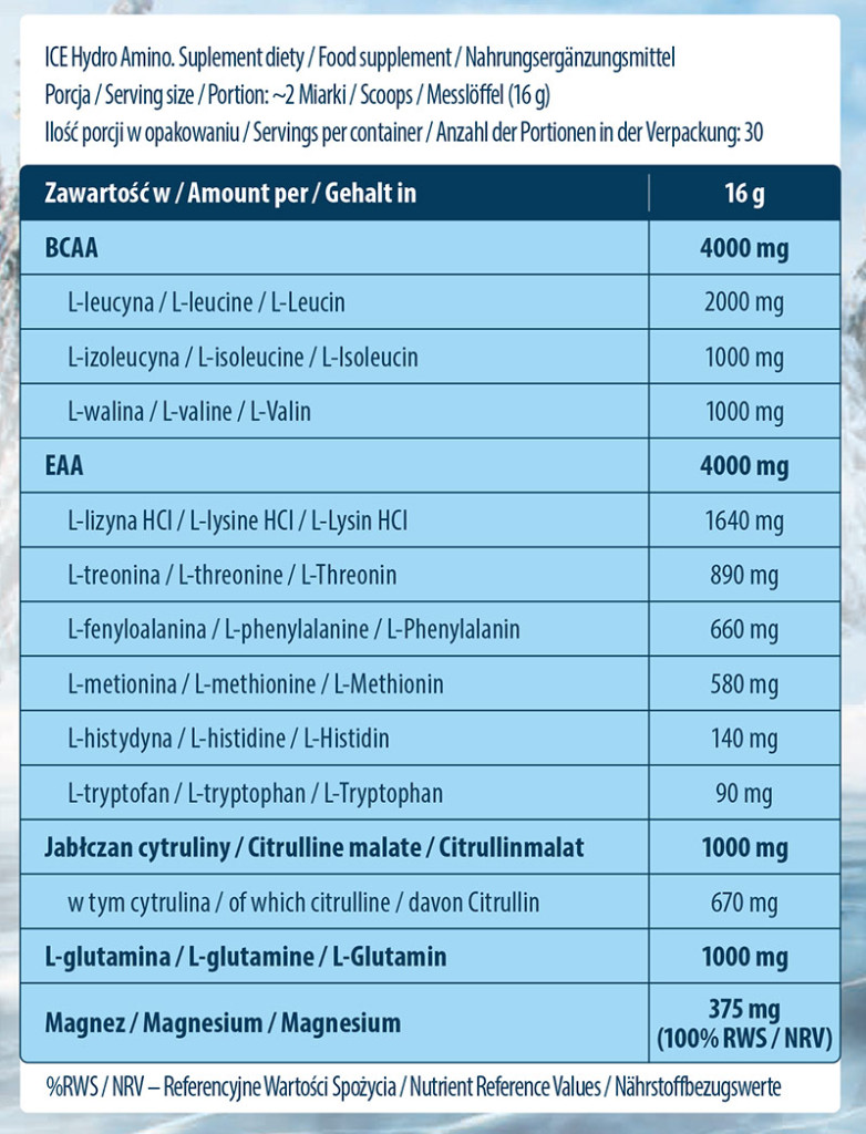 Ice Hydro Amino - ein Supplement, das reich an Aminosäuren ist und EAAs, BCAAs, L-Glutamin und Citrullin enthält.