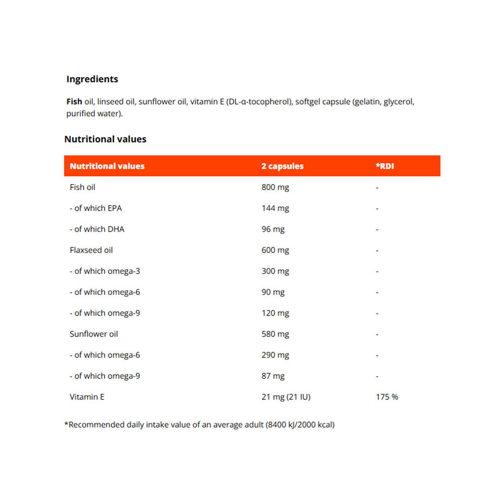 Jede Portion (2 Kapseln) enthält 800 mg Fischöl, das 144 mg Eicosapentaensäure (EPA) und 96 mg Docosahexaensäure (DHA) enthält. Gemeinsam unterstützen sie bei einer täglichen Aufnahme von 250 mg die normale Herzfunktion. Zusätzlich enthalten Lein- und Sonnenblumenöl eine breite Palette an Fettsäuren. Ergänzt wird dies durch Vitamin E, das zum Schutz der Zellen vor oxidativem Stress beiträgt.