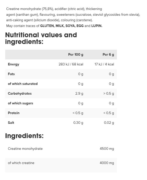 Mit Creatine Flavoured Zero von IronMaxx® versorgen Sie Ihren Körper mit 6g Pulver mit 4,5g Kreatinmonohydrat und somit 4g reinem Kreatin. Mischen Sie einfach 6 g Kreatinpulver mit 200 ml Wasser, um Ihre Kreatinspeicher aufzufüllen. Ein besonderes Merkmal dieses Produkts ist sein unwiderstehlicher Geschmack. Das Kreatin im 200-ml-Fertiggetränk ist sogar zuckerfrei, so dass Sie unser aromatisiertes Kreatin auch in Diätphasen bedenkenlos verwenden können