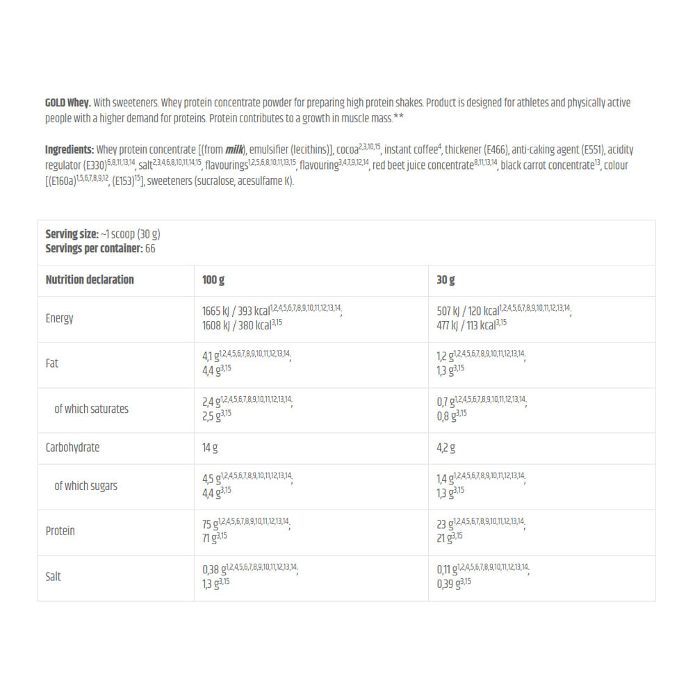 GOLD Whey. Mit Süßungsmitteln. Molkenproteinkonzentratpulver zur Zubereitung von eiweißreichen Shakes. Das Produkt ist für Sportler und körperlich aktive Menschen mit erhöhtem Proteinbedarf entwickelt. Protein trägt zu einer Zunahme an Muskelmasse bei.