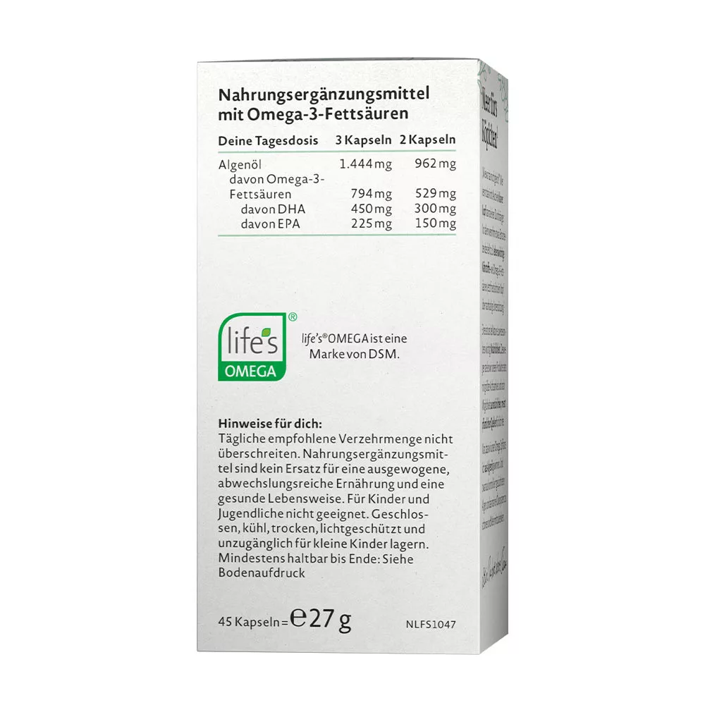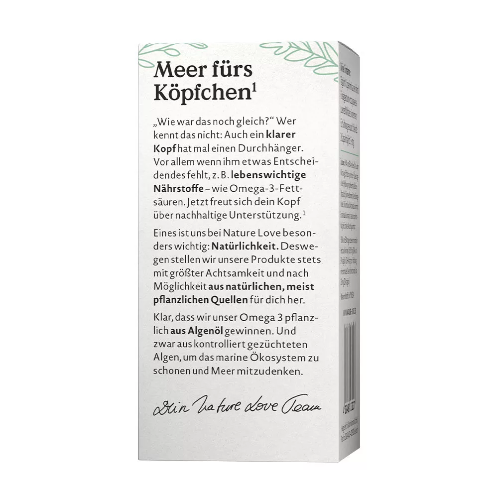 Wie war das noch gleich?" Wer kennt das nicht: Auch ein klarer Kopf hat mal einen Durchhänger. Vor allem wenn ihm etwas Entscheidendes fehlt, z.B. lebenswichtige Nährstoffe - wie Omega-3-Fettsäuren. Dann freut sich dein Kopf über nachhaltige Unterstützung. Wir gewinnen unser Omega 3 pflanzlich aus Algenöl. Und zwar aus kontrolliert gezüchteten Algen, um das marine Ökosystem zu schonen und Meer mitzudenken.