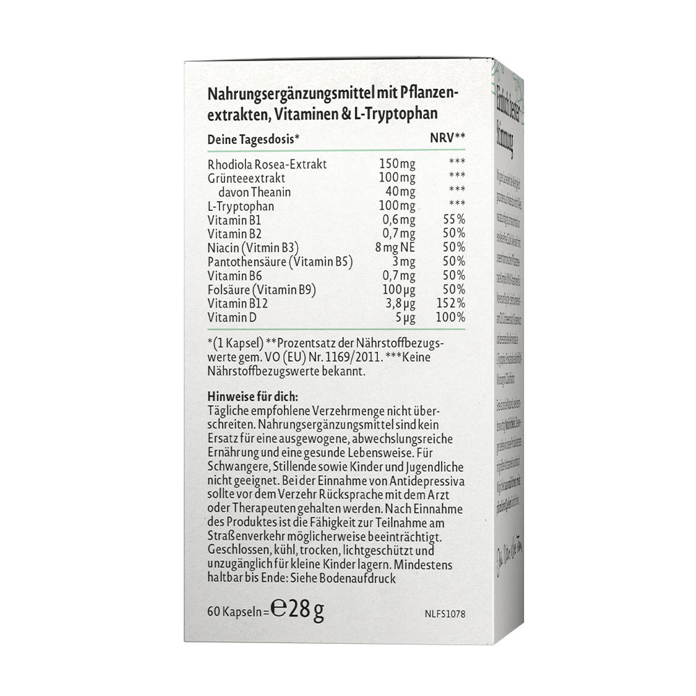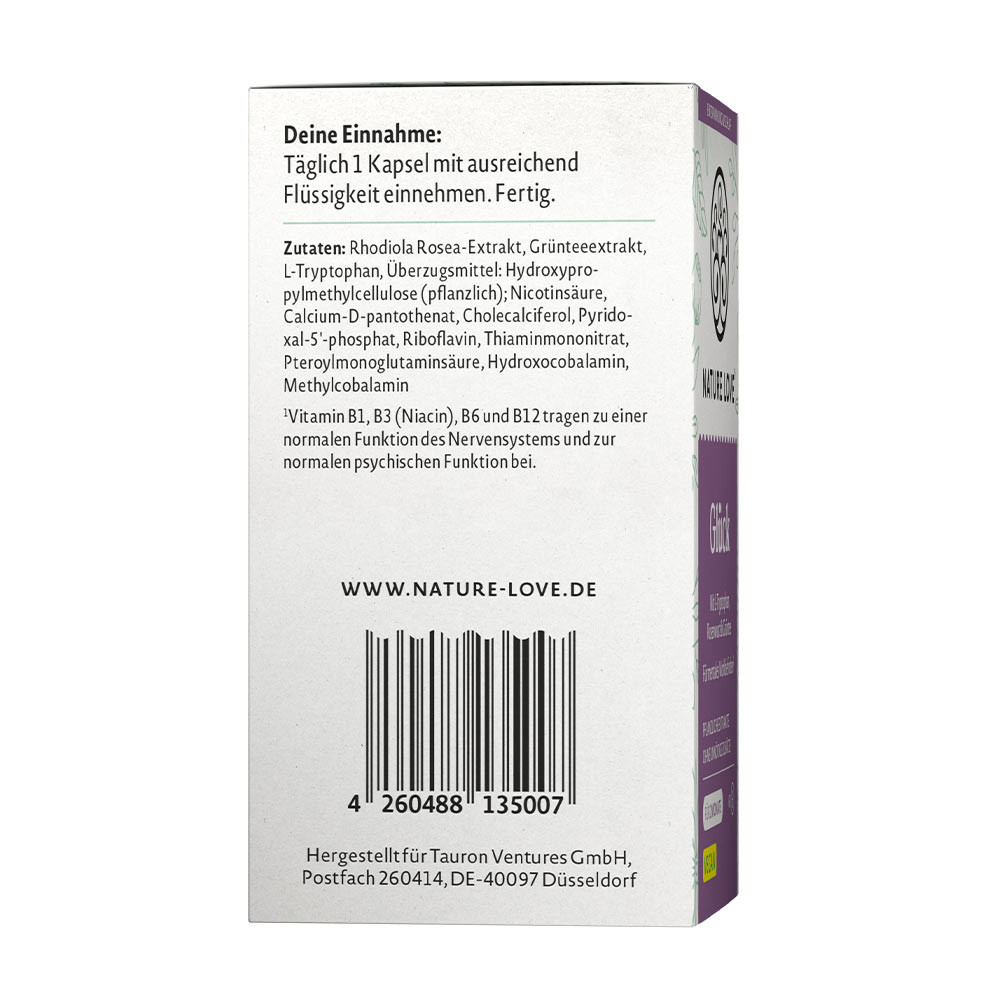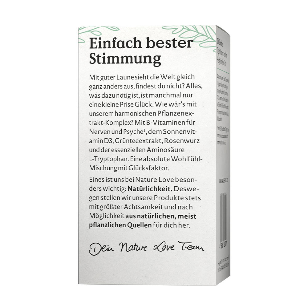 Nicht GVOMit guter Laune sieht die Welt gleich ganz anders aus, findest du nicht? Alles, was dazu nötig ist, ist manchmal nur eine kleine Prise Glück. Das gibt’s jetzt mit unserem harmonischen Pflanzenstoff-Komplex: mit 7 wichtigen B-Vitaminen u.a. für Nerven und Psyche,* dem Sonnenvitamin D3, Theanin aus Grünteeextrakt, hochwertigem Rosenwurz und der essenziellen Aminosäure L-Tryptophan. Insgesamt also eine absolute Wohlfühl-Mischung mit Glücksfaktor – und natürlich ganz entspannt ohne unnötige Zusätze.