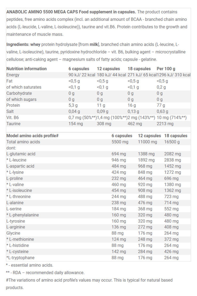 Bis zu 5,5 g reine und hochwertige Aminosäuren in einer Portion?! Und das alles in einer einzigen Beilage? Das ist jetzt möglich dank Olimp Anabolic Amino 5500 Mega Caps! Es handelt sich um einen Mehrkomponenten-Aminosäurekomplex, der in der Ernährung des Menschen unverzichtbar ist. Das Nahrungsergänzungsmittel, das auf der Grundlage aktueller wissenschaftlicher Forschung und langjähriger Erfahrung der Spezialisten des Pharmaunternehmens Olimp Laboratories entwickelt wurde, enthält optimale Anteile an Inhaltsstoffen, die mit Hilfe moderner mikrobiologischer Technologie getestet wurden. Dies ermöglicht eine einfache und bequeme Art der täglichen Nahrungsergänzung mit gesunden Aminosäurekomplexen aus Peptiden und freien Formen.