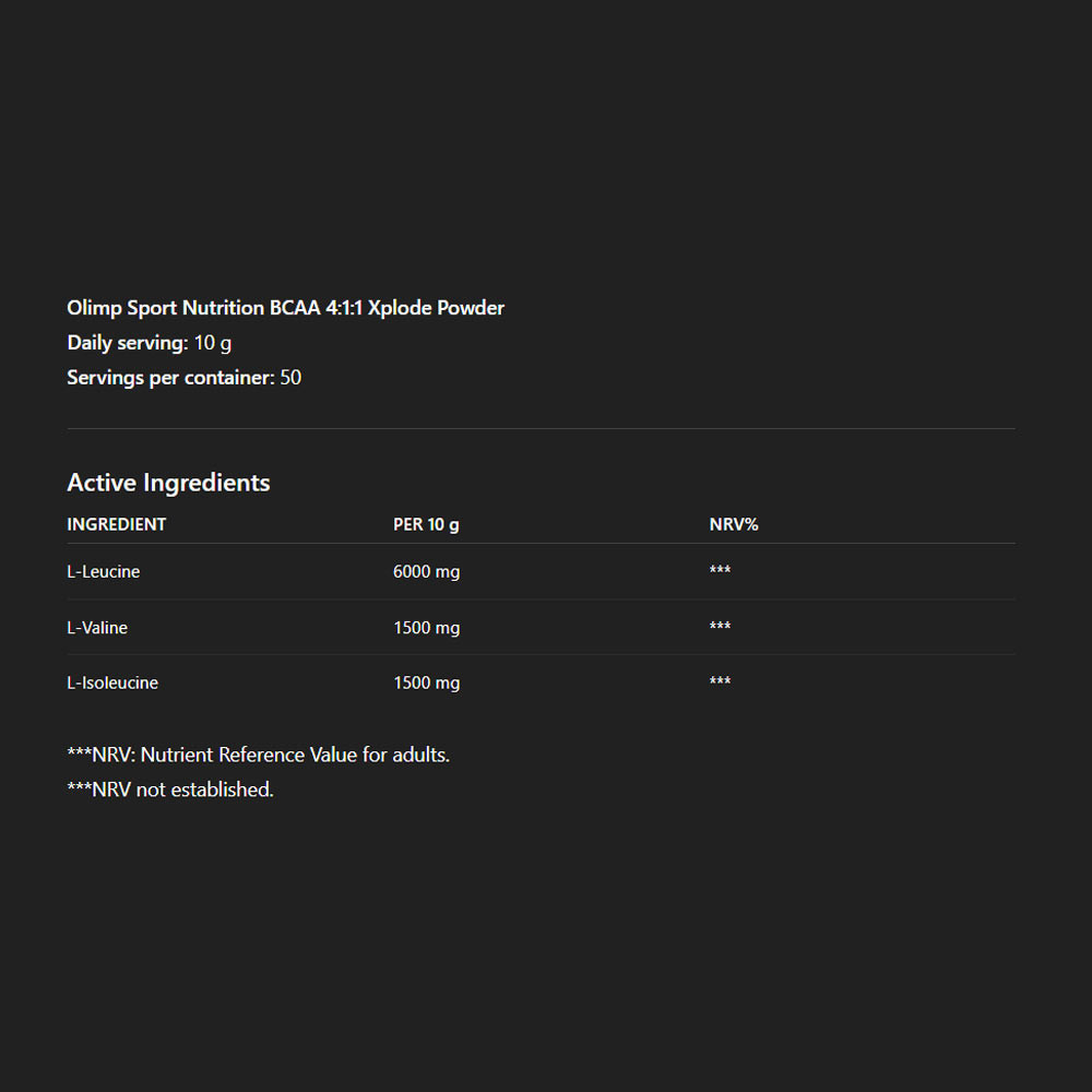 BCAA Xplode Powder 4:1:1 - Nahrungsergänzungsmittel in Pulverform, das einen Komplex verzweigtkettiger Aminosäuren enthält. Eine Zusammensetzung aus verzweigtkettigen Aminosäuren (L-Leucin, L-Valin, L-Isoleucin) im Verhältnis 4:1:1. Das Produkt ist für Erwachsene zur Ergänzung ihrer Ernährung mit Aminosäuren (L-Leucin, L-Valin und L-Isoleucin) bestimmt.