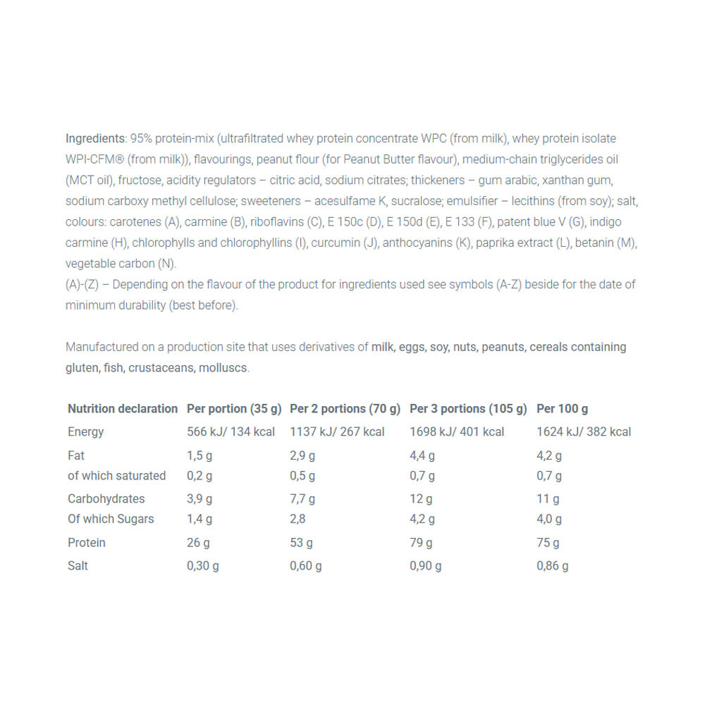 WHEY PROTEIN COMPLEX 100% – Nahrungsergänzungsmittel. Mit Zucker und Süßungsmitteln. Aromatisiertes Produkt. Hochkonzentriertes Eiweißpulver. Die Mischung aus hochwertigem, ultrafiltriertem Whey-Protein-Konzentrat und Whey-Protein-Isolat. Das Produkt ist für körperlich aktive Personen und Sportler gedacht, die den Aufbau von Muskelmasse anstreben. Eiweiß trägt zum Wachstum und Erhalt von Muskelmasse bei.