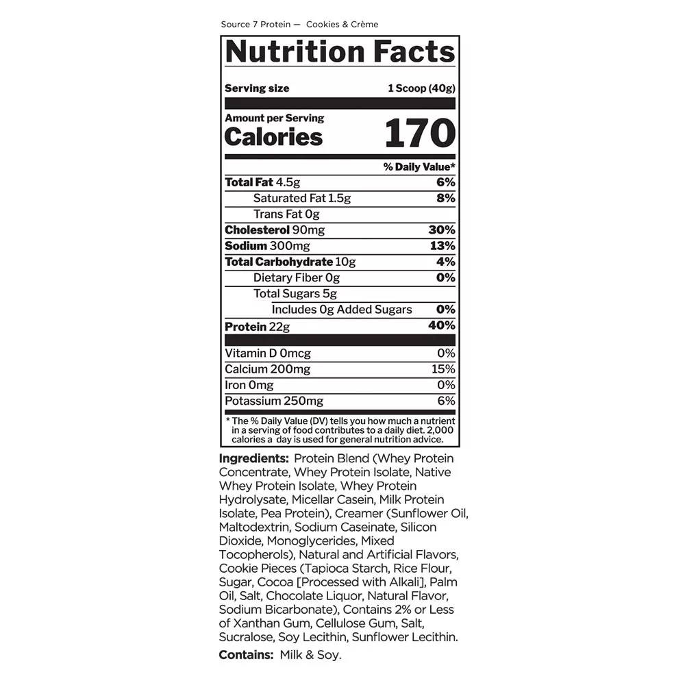 Source 7 Protein kombiniert sieben hochwertige Proteinquellen in jedem ultra-cremigen, extra-dekadenten Shake. Der außergewöhnlich gute Geschmack wird durch einfache Mixbarkeit und 22 Gramm hochwertiges Protein pro Portion ergänzt. Es ist perfekt für alle, die mit einer Proteinreise beginnen oder eine köstliche Abwechslung zum üblichen Scoop suchen—Source 7 Protein ist eine hervorragende Ergänzung für einen aktiven Lebensstil, zu jeder Zeit oder immer.